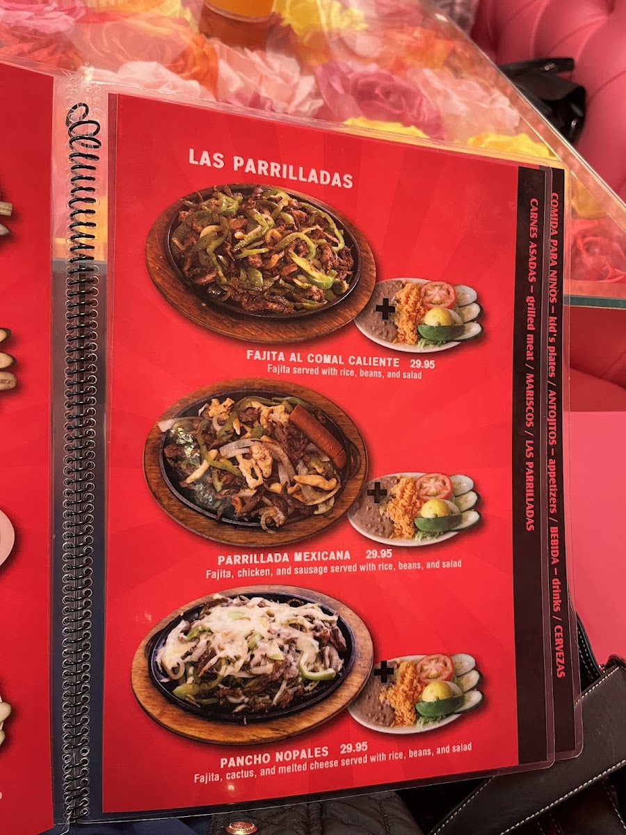 - Las Parrilladas: For the main event, indulge in sizzling options such as the Fajita Al Comal Caliente or Pancho Nopales, each served with rice, beans, and salad for $17.99.